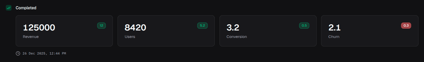 | changeType | Type of change for styling | 'positive' | 'negative' | 'neutral' | No | undefined |